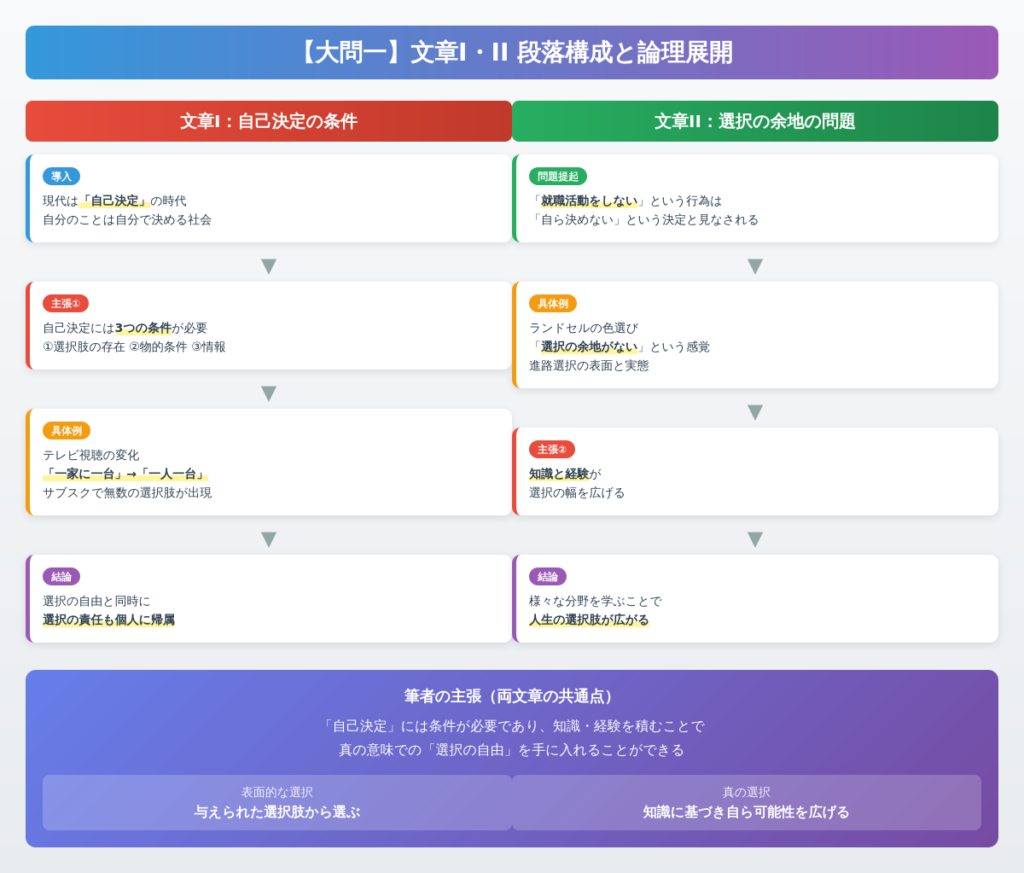 この文章は「文章I」と「文章II」の二部構成になっています。どちらも「個人化社会における自己決定」というテーマを扱っています。