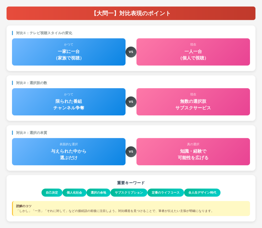 「しかし」「一方」「それに対して」などの接続語に注目すると、対比構造を見つけやすくなります。
