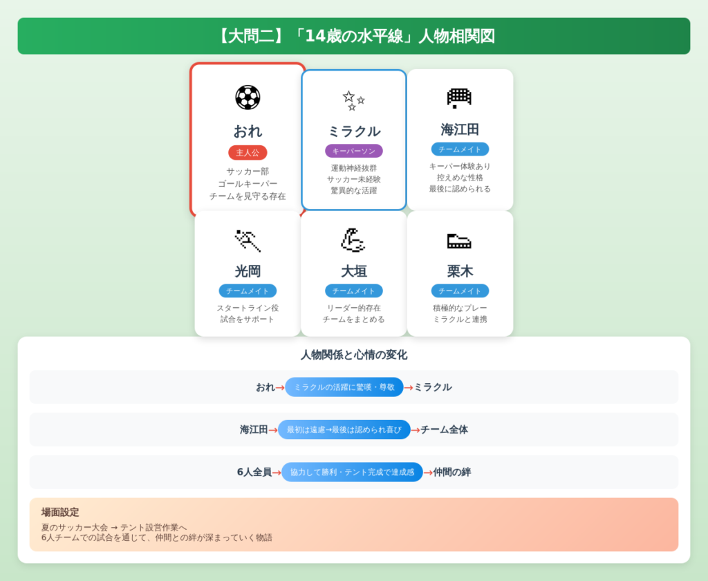 おれ(主人公):サッカー部に所属するゴールキーパー。チームを見守る存在として描かれています。