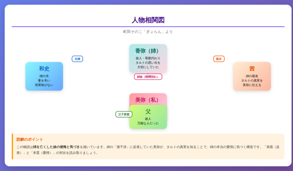 傍にいるのが当たり前だった姉。言わなくても大丈夫だと思っていた感謝の気持ち。しかし、姉がいなくなって初めて、姉の深い愛情に気づく。「表面(反発・疎ましさ)」と「本質(愛情・感謝)」の対比が、この物語の核心です。