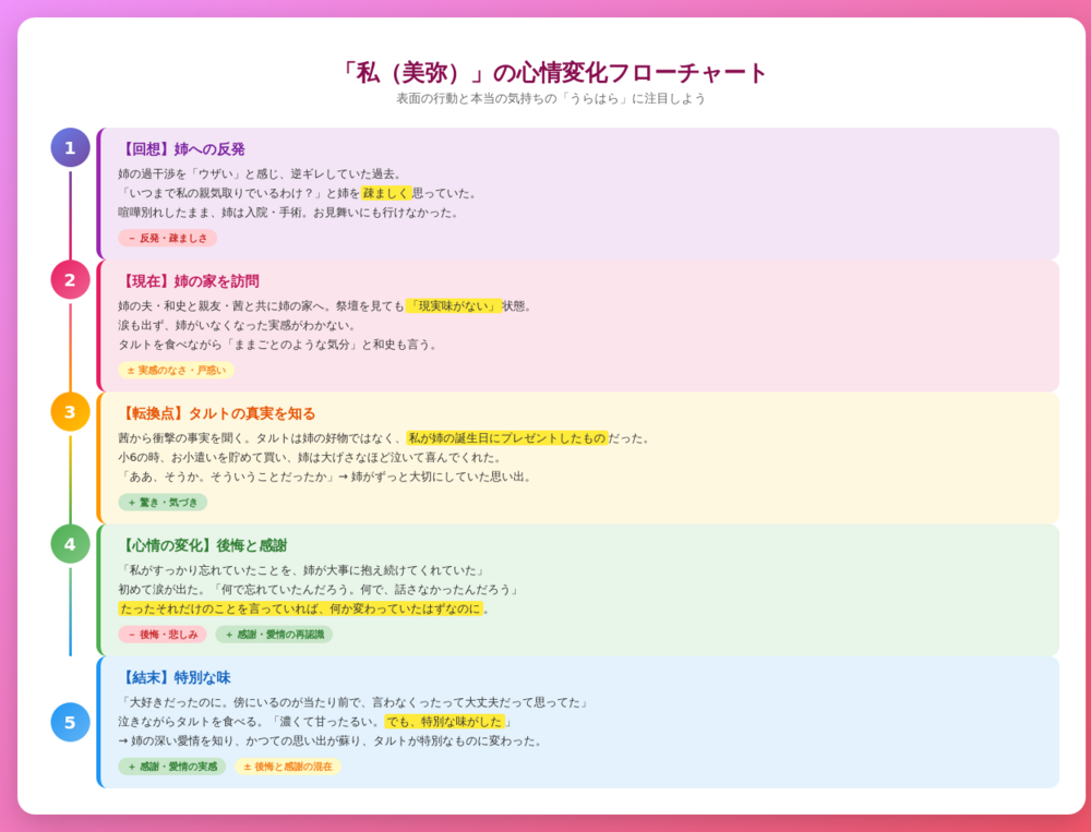 「でも、特別な味がした」:タルトの味そのものではなく、姉との思い出や姉の愛情を知ったことで、同じタルトが「特別なもの」に変わったことを表している。
