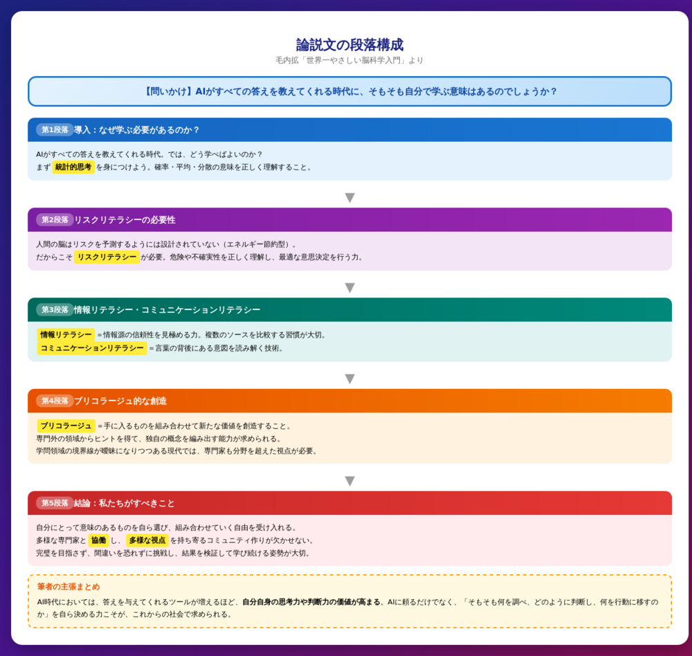脳科学者である筆者が、AI時代における「学び」の意味を論じた文章です。AIがすべての答えを教えてくれる時代に、なぜ自分で学ぶ必要があるのかという問いかけから始まり、「リテラシー」の重要性を説いています。