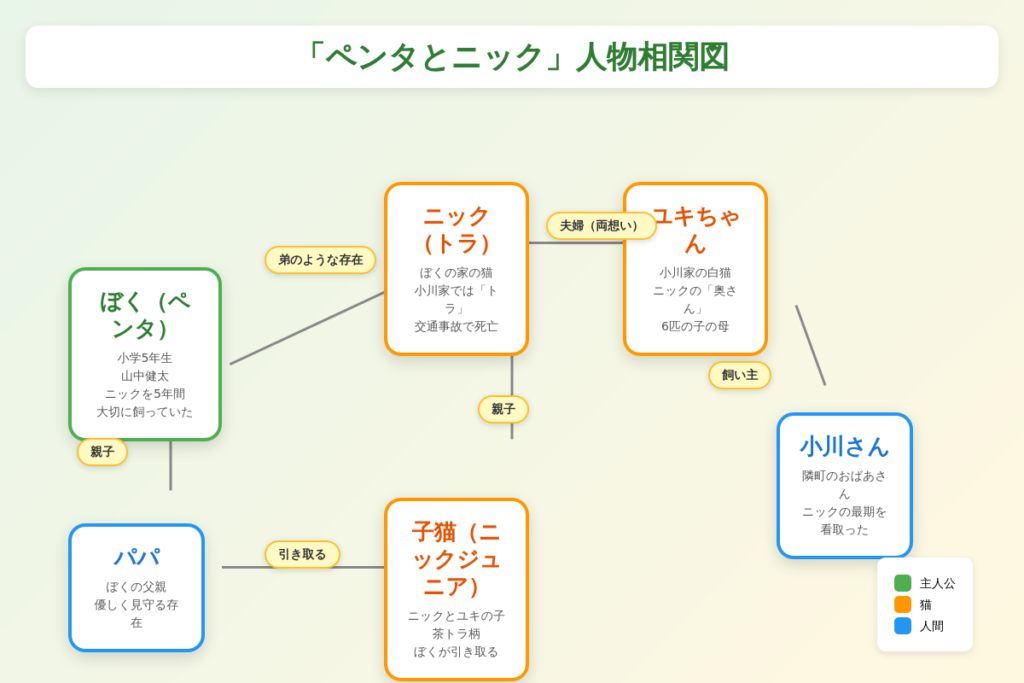 - ぼく(ペンタ/山中健太):小学5年生の主人公。ニックを5年間大切に飼っていた
