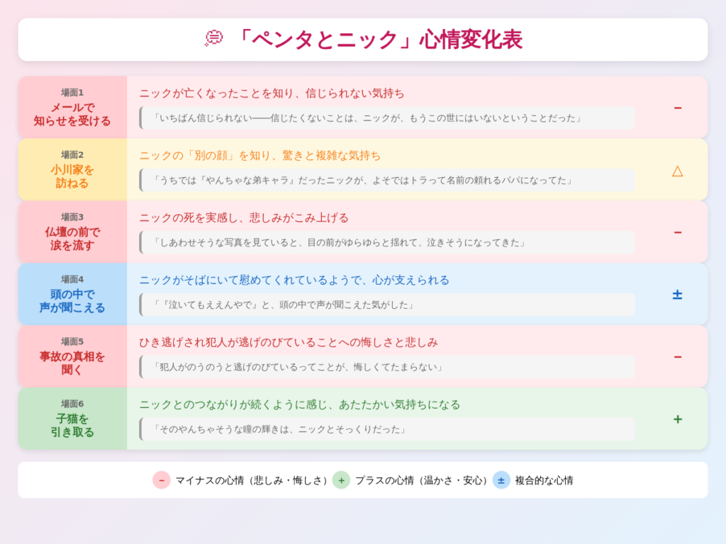 最初は「ニックが亡くなった」という悲しみでいっぱいだったぼくが、最後には「ニックの子どもを引き取る」ことで、悲しみの中にも温かさを感じるようになっています。