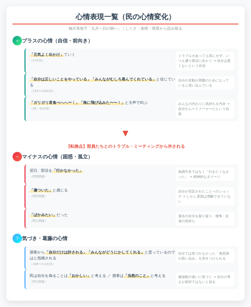 民の視点で語られているため、民の考え方が「正しい」ように見えてしまいます。しかし、菜穂の沈黙や朋香の指摘から、客観的には民の言動に問題があることを読み取る必要があります。「語り手の視点」と「客観的な事実」を区別する力が問われています。