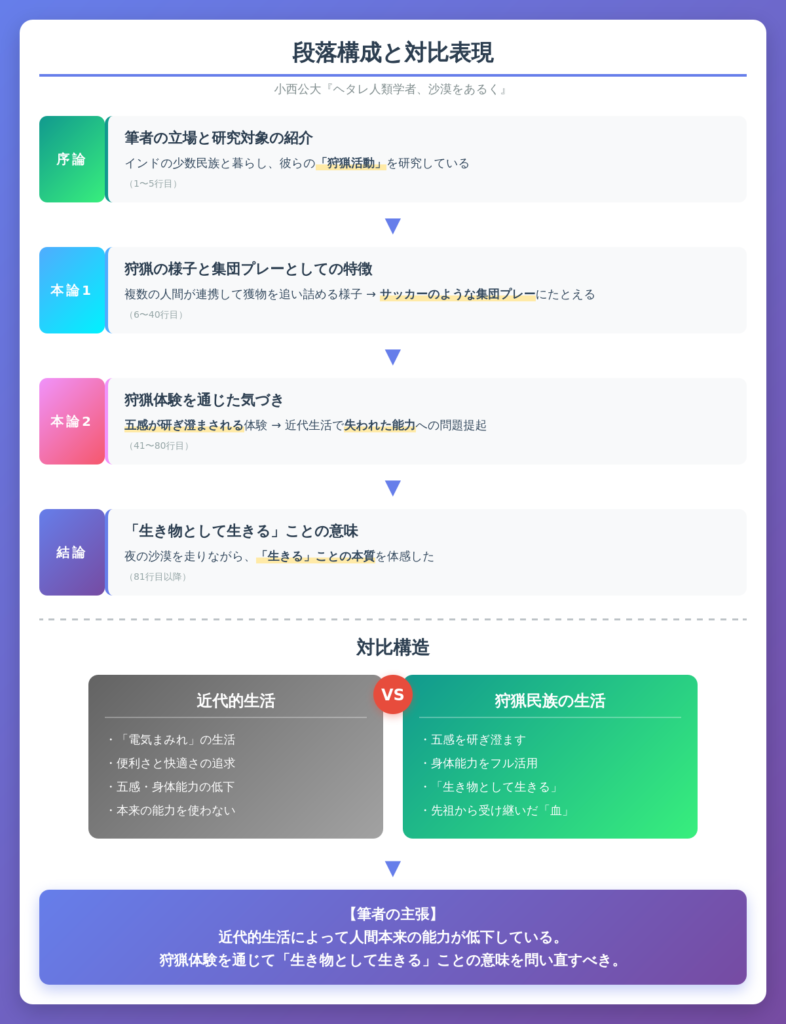 狩猟の描写が長く続くため、筆者が最終的に何を主張したいのかを見失いやすい構成です。「近代生活への批判」「生き物として生きることの意味」という二つの軸を意識しながら読むと理解しやすくなります。