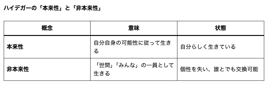 「非本来性」の状態では、個性を失い「みんな」の一員となる。自分らしさを持たず他者と同じように生きているので、個人の存在意義を失った状態にある。