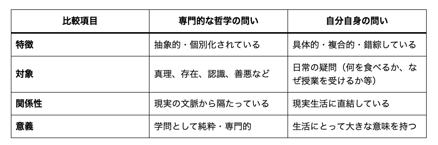 この文章の核心は「専門的な哲学の問い」と「自分自身の問い」の対比です。